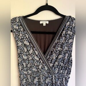 Blue and black floral pattern, tiered dress, with v-neck/crossover top