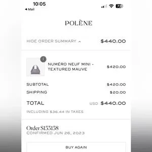 Brand new in box with dust bag. Never used or taken outside. Bought on a whim two years ago and never got around to using it and downsizing my handbag collection. Such an adorable bag, beautiful lavender color with high quality leather. Authentic, purchased directly from Polene, please see screenshot of my order. Pet and smoke free home. Will ship in original box inside a larger box. Thanks for looking!
