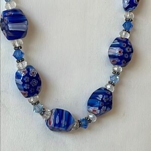 Offering a DOL millefiori necklace featuring blue millefiori beads w complimentary crystal beads.