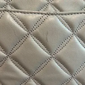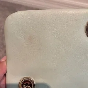Some light wear on the bottom, 2 small blemishes on the inside flap and a very small surface tear on the back. Small blemish on the back that can be washed.