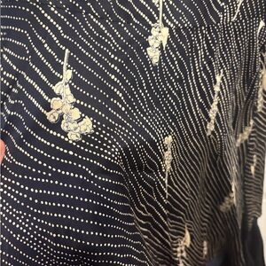 Stylish navy kimono dress with white patterns. Features a tie-front design and flowing sleeves. Flowy, pretty, feminine and romantic! Can be tied at side or kept open and layered.