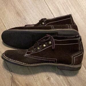 Unbranded, brown, suede leather loafer-booties. Cream top-stitching with gold accents. Brown laces. Fits 8-8/12. Found at a thrift store. Gently used, soles show usage.