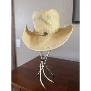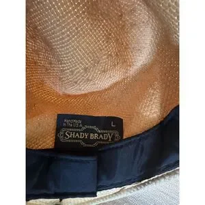 Keywords: Shady Brady, cowboy hat, unisex adults, beige hat, flexible brim, decorative band, breathable design, raffia straw, handmade hat, Western theme, summer hat, casual occasion, pre-owned hat, United States made, large size hat.