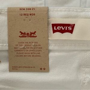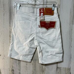 Waist size 26, Classic white jean shorts by Levi's. Features distressed details. Ideal for casual wear.