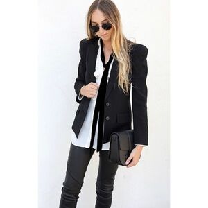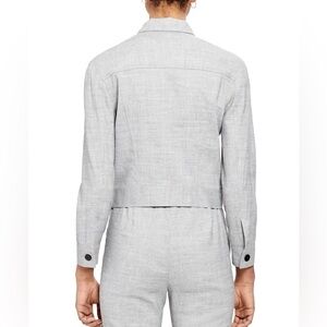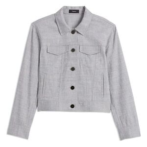 Theory light grey linen jacket featuring pointed collar, button front closure, long sleeves with button cuffs, two flap pockets at chest, two vertical placket pockets at hip, and seam detailing throughout. Unlined.