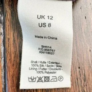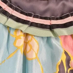 This dress is new, but the tags are no longer on it. I have never worn this dress. It’s a women’s size 8. From bust to bust it measures 17. In the waist, it measures 15 inches. From the waist to the knee, it measures 24 inches in length. There is a zip closure on the left-hand side. The dress does have lining you’ll see a beautiful ribbon detail along the top of the collar and the waist. The shell is 100% silk and the lining is 100% polyester. The colors included are pink, mint, green light, blue, yellow, and gray. The dress definitely fits like a midi.