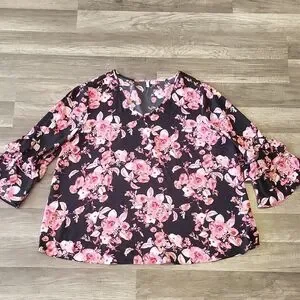 Black and Pink Ruffled 3/4 Sleeve Blouse