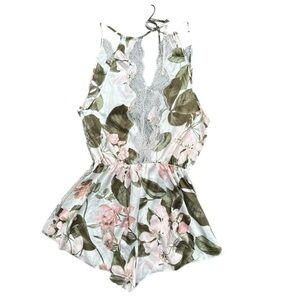 Size small. Chemise. Pull on. Spaghetti strap. Floral print. Elastic waist. Sleeveless. Lace on sides and neckline (front and back). Self tie keyhole back. Lightweight. Satin material. Here Comes The Bride collection. Bridal. Honeymoon.