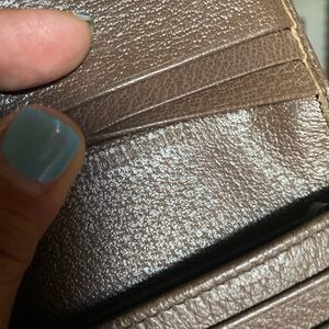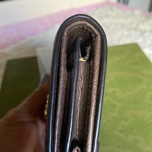 Stylish Gucci wallet in beige and brown. Features iconic red and green stripe. Perfect for any occasion.