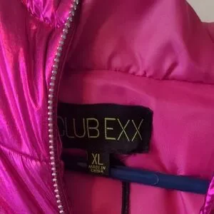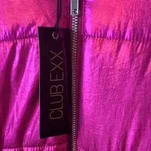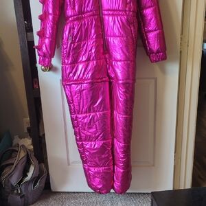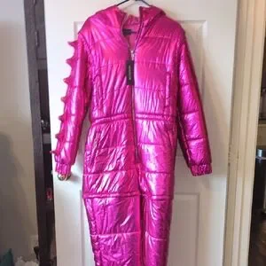 Stay warm and stylish on the slopes with this vibrant pink metallic ski jacket. Perfect for winter adventures.