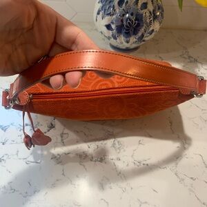 Authentic Longchamp Orange shoulder bag. The material in this is like a felt/cloth material with a leather handle and leather rosettes for the zipper pull. Zipper runs smoothly. Outside is clean no dirt at all for her age. Inside is clean with no odors. Vibrant orange color. This I the perfect pop of color for any wardrobe! Smoke free home.
