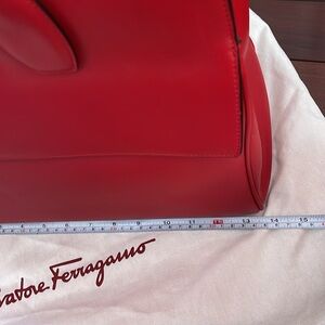 Excellent gently used condition. Shape is intact. Elegant Salvatore Ferragamo handbag in vibrant red calfskin leather. Features a classic top handle design with gold-tone hardware. Includes a matching detachable strap. This is a medium size.