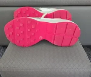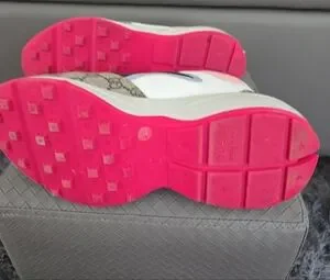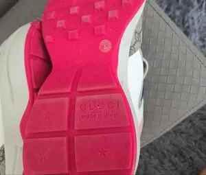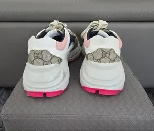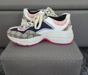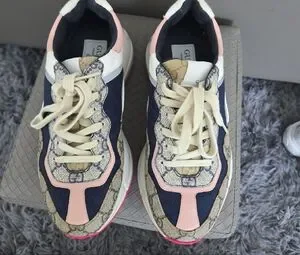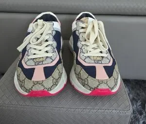 Stylish Gucci sneakers in navy and cream. Features iconic pattern and pink accents.