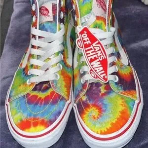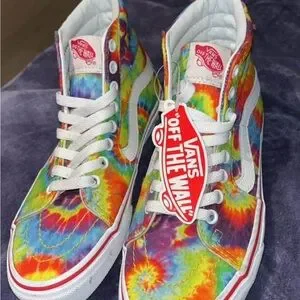 Bold Custom made Vans high-top sneakers with a vibrant tie-dye pattern. Features white laces and signature side stripe. Never worn. New with tags. Size 6.5.
