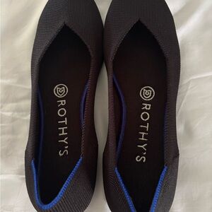 Experience the perfect blend of style and comfort with Rothy's flats, featuring a sleek black design accented by a vibrant blue stripe. These minimalist shoes are ideal for both casual and business casual settings, offering a chic and professional look. With a rounded toe and flat sole, they ensure all-day comfort without compromising on elegance. Gently used.