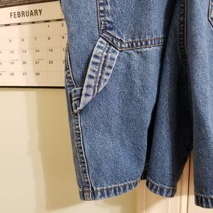 Denim jean utility short bib overalls/dungarees/shortalls. Button sides. Adjustable straps. Utility cargo pockets. Carpenter hammer strap. VINTAGE! 90s!