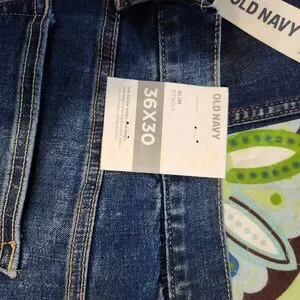 These Old Navy relaxed jeans feature a classic indigo blue wash with natural fading and whiskering patterns, offering a timeless look. The medium-weight denim ensures comfort and durability, making them perfect for casual wear.