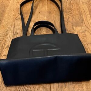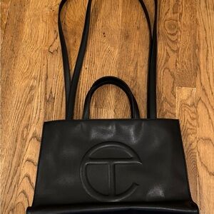 Telfar Unisex Shopping Bag. Has a double strap (handles and cross-body straps), embossed logo, a main compartment with magnetic strap closure and internal zipper pocket. Made from faux leather and has a twill lining. Height 11 1/4”, Width 15”, Depth 5”, Strap Drop 21”, Handle drop 5 1/2”. Great condition and minor edge wear on corners as shown. Dustbag included.