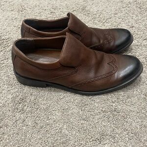 Stylish brown leather loafers by 7 For All Mankind. Features a sleek design with black toe accents. Perfect for casual or formal wear.