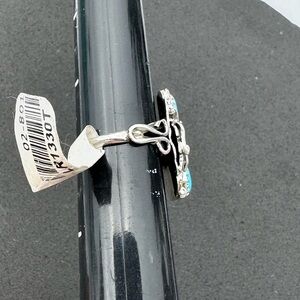 Sterling silver ring featuring vibrant 2 turquoise stones in a Navajo leaf design. Perfect for adding a touch of color to any outfit.