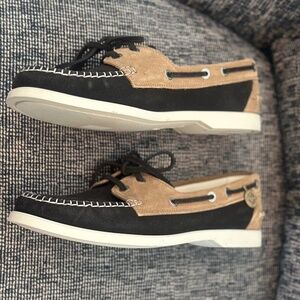Dark Grey and Tan with white stitching. I am selling these for my mother and she threw away the box! These moccasins/loafers have never been worn.