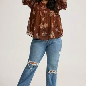 🌹 Sheer Brown Rose Print Ruffle Sleeve Blouse – Torrid Size 0 🌿 #boho #cottage