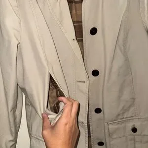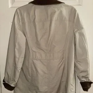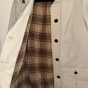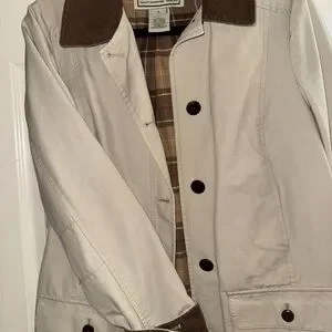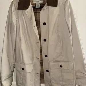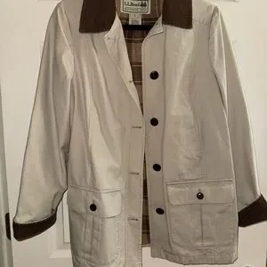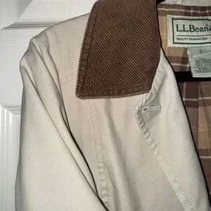 Classic L.L. Bean Adirondack barn coat in khaki with a dark brown collar. Features plaid lining and buttoned pockets.