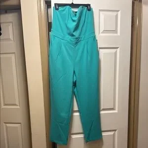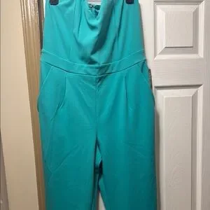This striking blue jumpsuit from Express features a sleek strapless design and a full-length straight leg silhouette. Crafted from a solid, structured fabric, it offers a modern and clean-lined look perfect for making a bold statement.