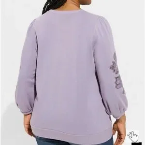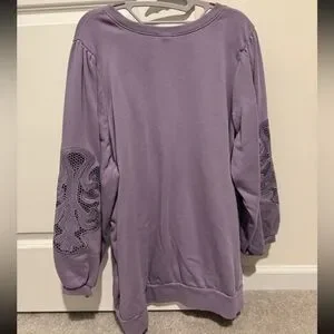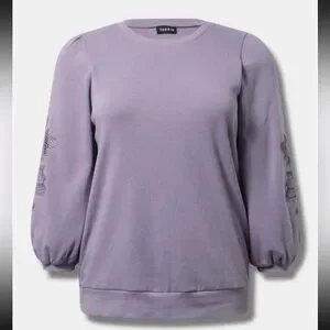 Elegant lavender top with intricate embroidery on the sleeves. Perfect for a stylish and comfortable look.