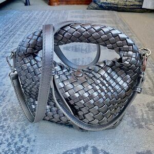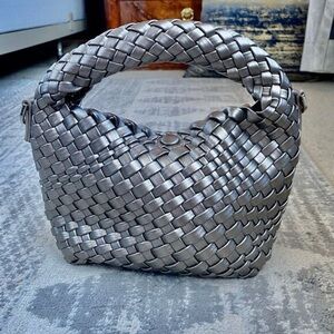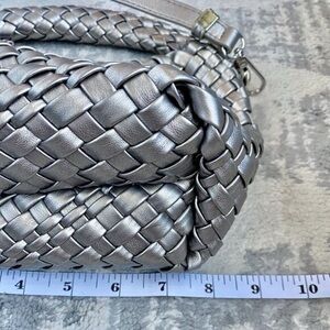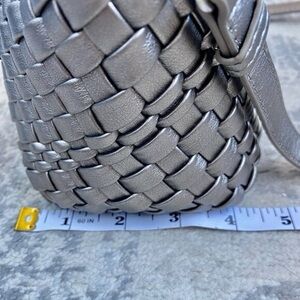 Silver braided faux leather crossbody bag in great used condition Removable crossbody strap can also be worn as handbag Small mark on inside base of bag Button clasp on outside rounded handle Bag measures approx 9 inches long 5 5 inches tall and 4 5 inches wide Cat friendly nonsmoking home