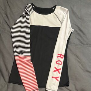 Discover the sleek design of the Roxy long sleeve top, featuring a fitted silhouette and an asymmetrical style. Stretch, elastic material. Like a swimsuit material, perfect for water sports or adventures. Sporty look