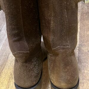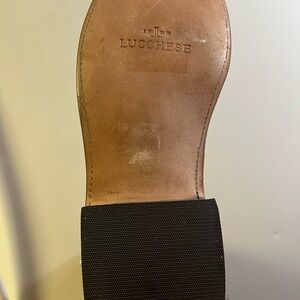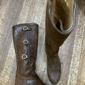 Elegant Lucchese boots in rich brown leather. Features a stylish buckle accent.