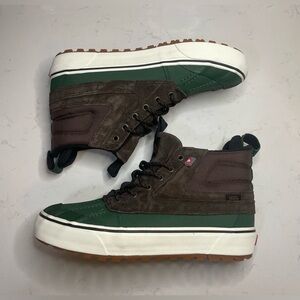Embrace the elements with Vans' Green and Brown Rain & Snow Boots, designed for both style and functionality. These boots feature a durable green rubber toe cap and a brown canvas upper, offering a rugged yet fashionable look. With their high-top design and classic Vans silhouette, they provide excellent protection and comfort for wet and snowy conditions.