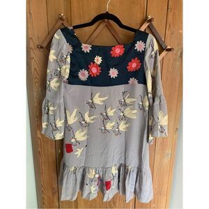 Coreylynncalter silk tunic mini dress with dove and love-birds print square neckline with ruffled hemline and sleeves. Excellent condition pullover silhouette
