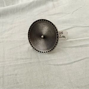 Elegant silver ring with a spiral design. Features intricate detailing.