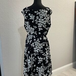 Elegant black and white floral dress perfect for any occasion. Features a flattering silhouette and a stylish floral pattern. Ideal for both casual and formal events.