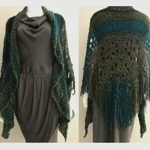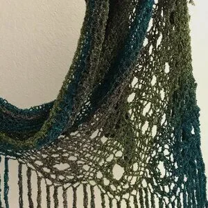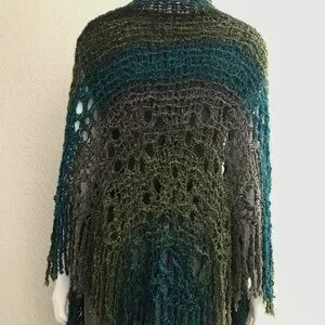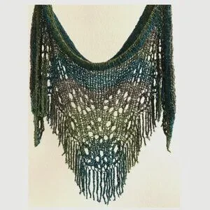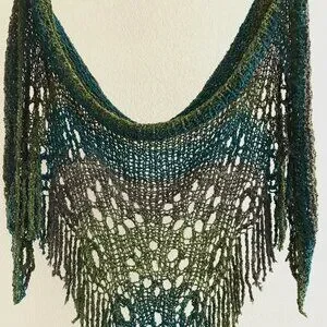 Fiber: Boucle lace gradient yarn with blue-turquoise-brown-green tones. Soft and airy.