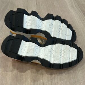 Sorel sandals with white straps and orange accents. Comfortable and stylish design. Some sign of wear but still in good used condition.