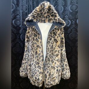 Stay stylish and warm with this elegant black jacket featuring a luxurious leopard print faux fur. This jacket is reversible, so wear it either way! Perfect for any occasion.