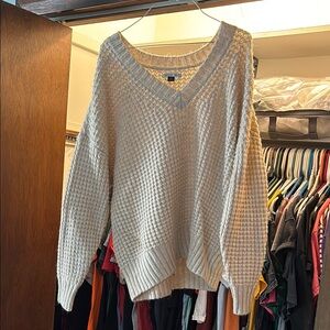 Experience the timeless elegance of this cream V-neck sweater from American Eagle Outfitters, featuring a classic knit design. Its soft, neutral tone makes it a versatile addition to any wardrobe, perfect for both casual and sophisticated looks.