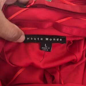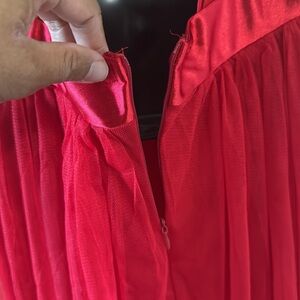 Stunning red dress with sequin details. Features a V-neck and adjustable spaghetti straps. Zip up in back. Used once. Great condition, like new. No slit.