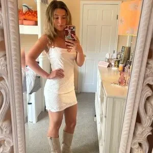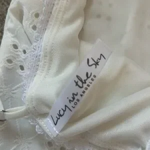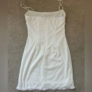 This dress is a clean white color with eyelet detailing and a cute orange flower on the neck line. Perfect for a country concert or graduation! It’s also very comfortable, and has a zipper in the back with adjustable straps.