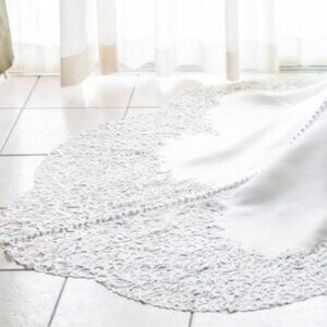 Size 14 and altered 1 time. Stunning elegance in simple yet intricate design. Overskirt is a separate piece and removable for reception. Dress has a French Bustle for your dancing pleasure and ease. This is a steal of a deal at $1299