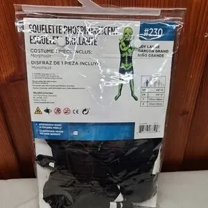 NEW . see size in pictures. Light up the night with the Glow Skeleton Morphsuit. This black and green costume is perfect for kids who love to stand out. Ideal for Halloween or costume parties, it glows in the dark for extra fun.