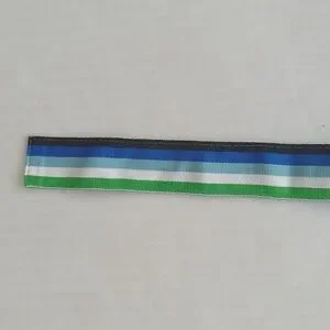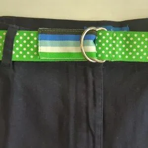 The contrasting green belt is polka-dot and stripes with silver tone buckle