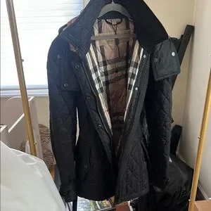 Elegant black quilted coat. Features classic Burberry check lining. Ideal for sophisticated style.