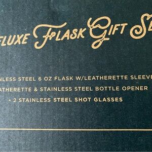 Adventure flask gift set with leatherette and stainless steel. Includes flask, bottle opener, and shot glasses.New in Box