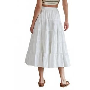 Discover the For A Moment Midi Skirt by By Together, a versatile addition to your summer collection in elegant off white. This solid, cotton piece showcases a mid-length, tiered ruffled design with a comfortable pull-on closure. Crafted entirely from 100% cotton, this imported skirt provides exceptional comfort and style for any occasion. Care instructions include hand washing to maintain its pristine look, while the model showcasing it is 5'5" with a 32" bust, 26" waist, and 35" hips, wearing a size small.