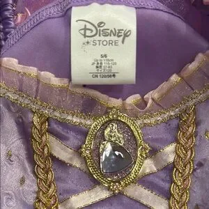Disney Rapunzel costume, featuring a layered tulle skirt and a beautifully detailed bodice with gold embellishments, perfect for Halloween princess adventures. Worn once, includes a matching hair tie
