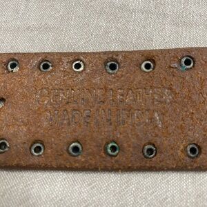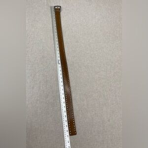 That belt is pre-owned in good condition. Stylish tan leather belt by Calvin Klein Jeans. Features a bold silver buckle and stud accents.